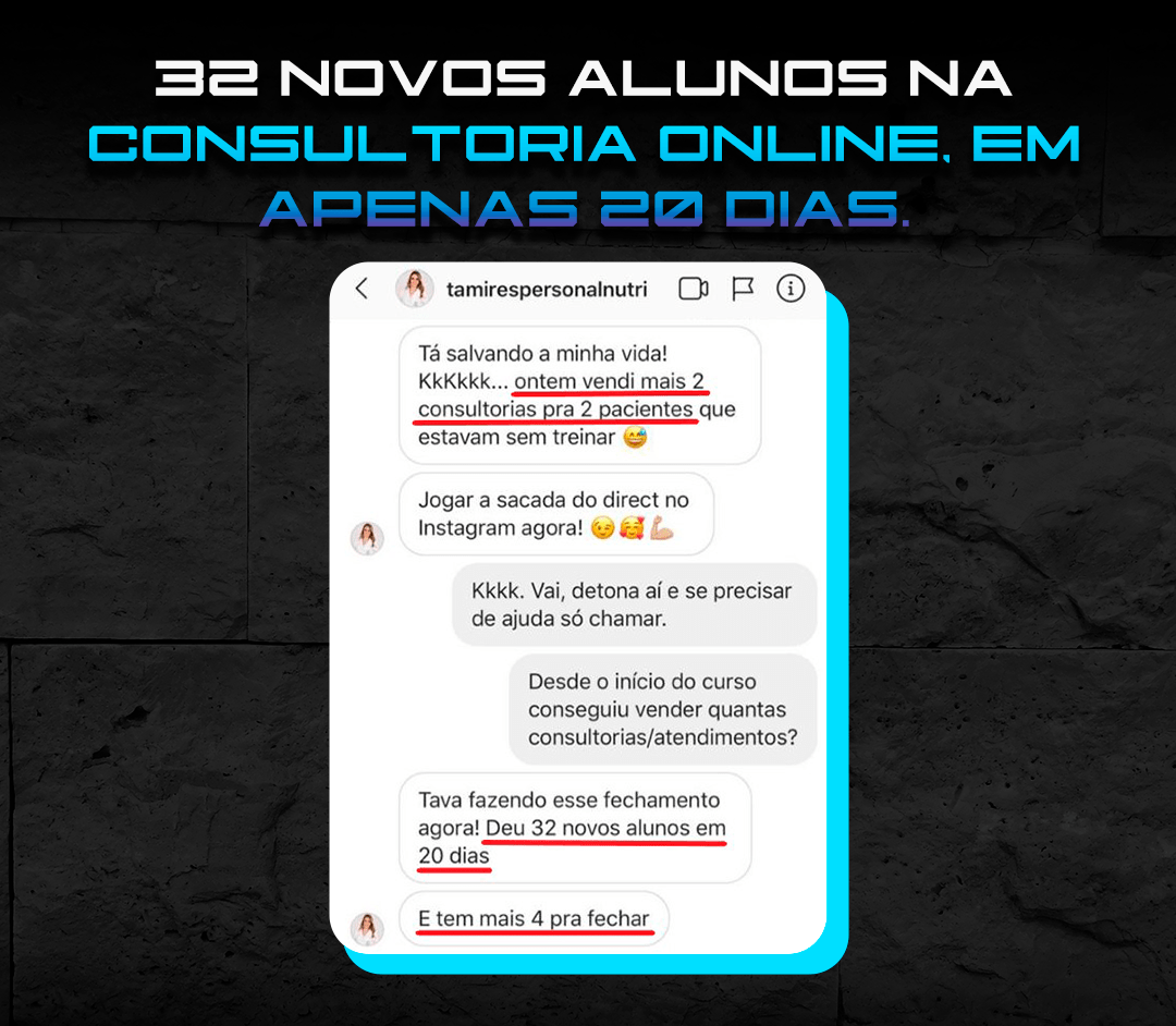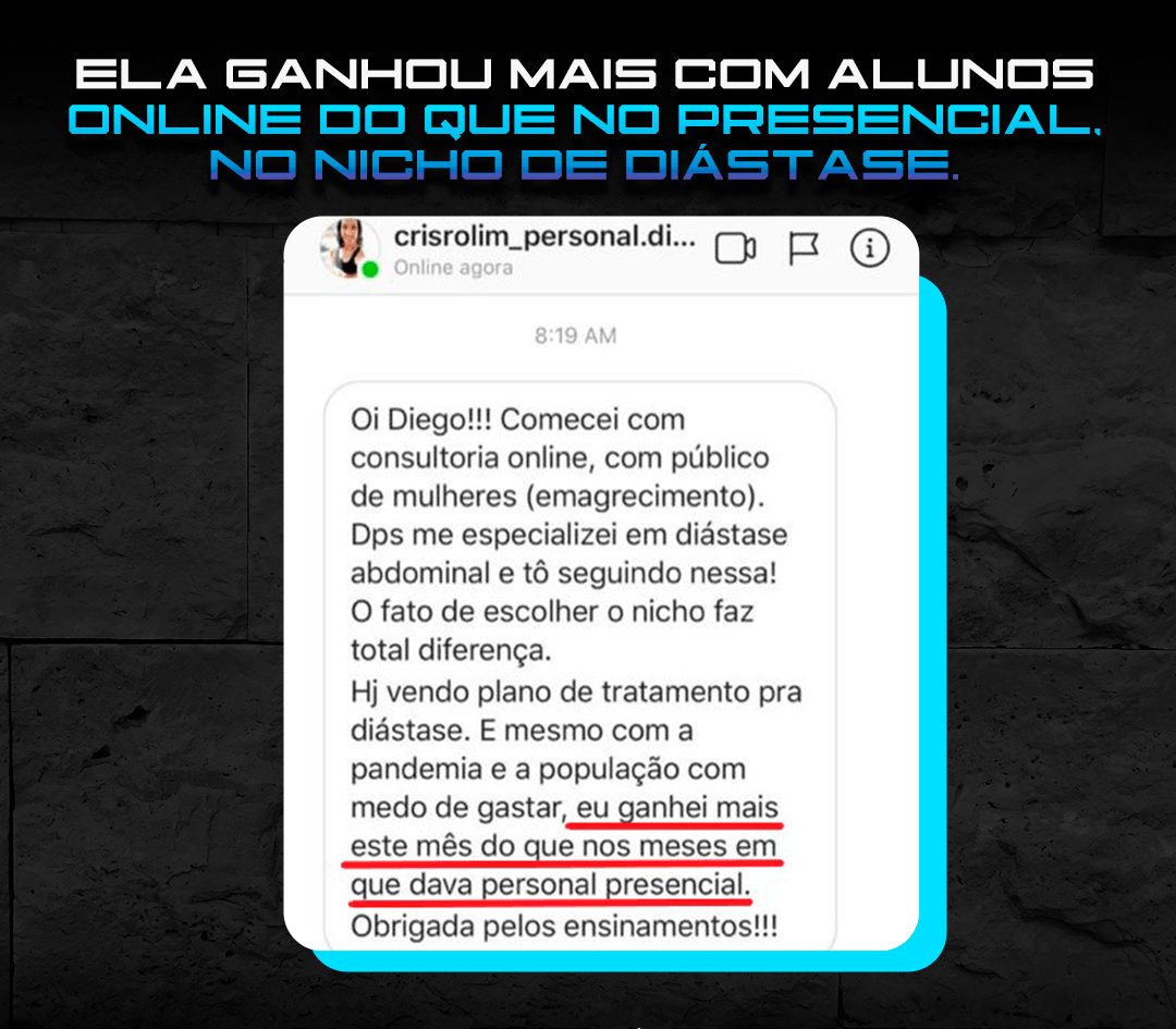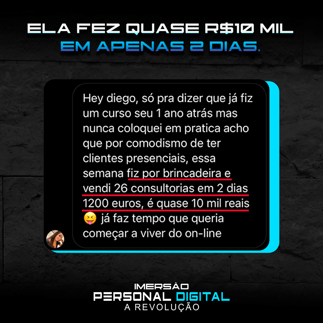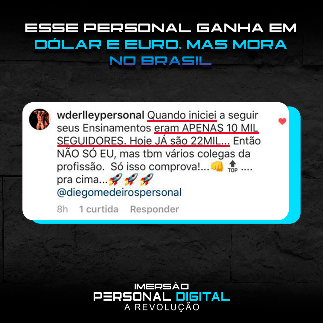 “Só sei de uma coisa: esse Diego Medeiros tinha que ter aparecido na vida da gente antes! Hoje joguei no insta perguntando quem queria que a academia fosse até eles. 80 responderam sim! 32 Vendas convertidas! Já estou até pensando em largar o personal presencial.”