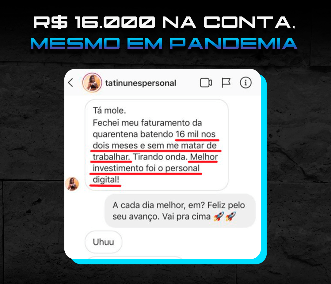“Fechei meu faturamento da quarentena… Batendo R$ 16.000,00 nos dois primeiros meses e sem me matar de trabalhar. Tirando onda… O melhor investimento foi o Personal Digital!”